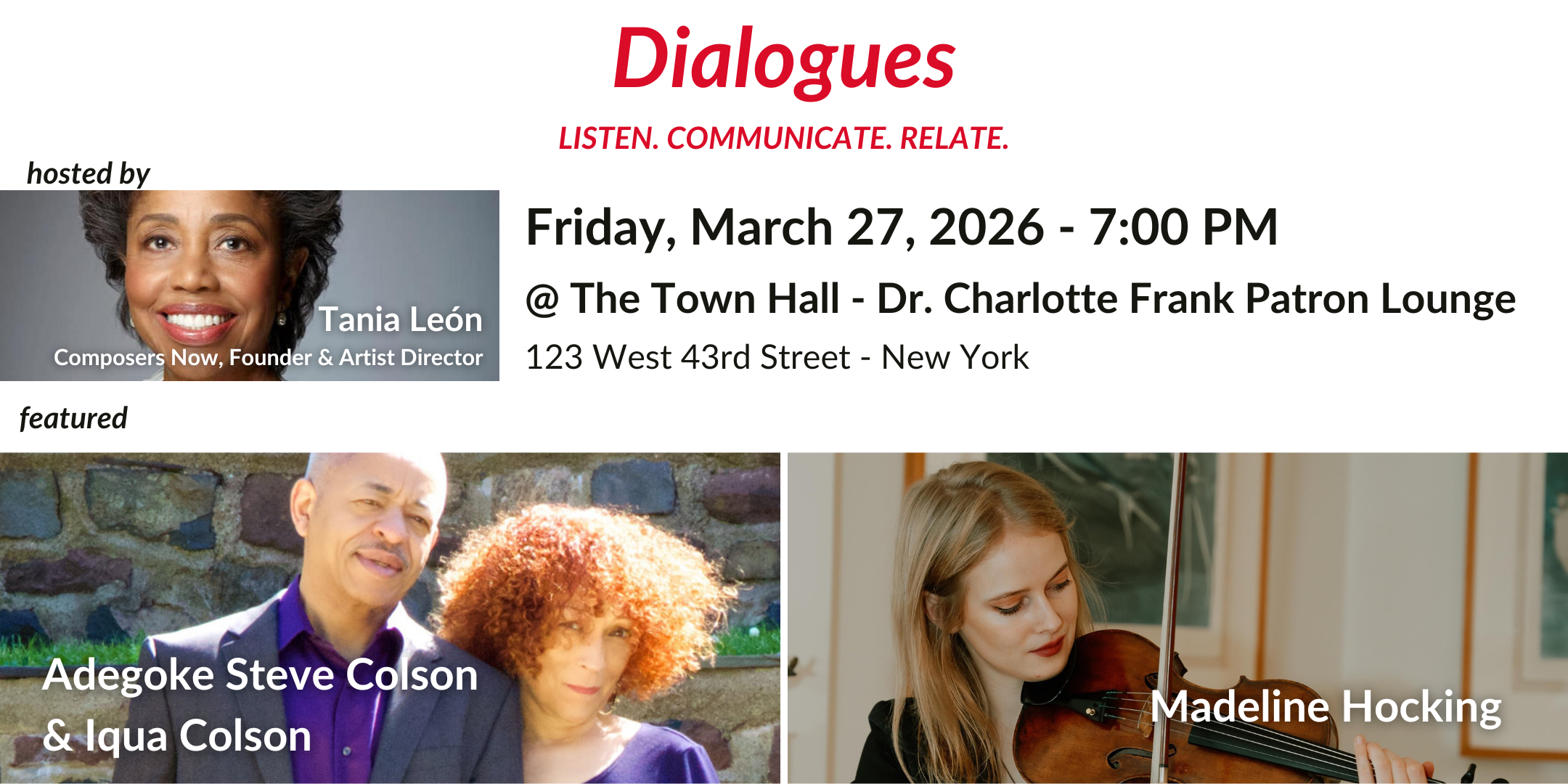 Events in the series open with inspiring performances, followed by thought-provoking town hall-style conversations and a forum for meaningful exchanges of ideas between composers, performers, and audiences.
